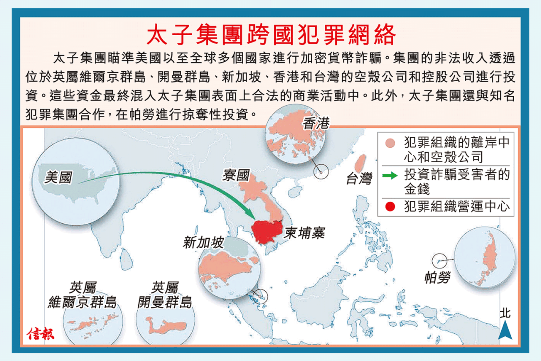 太子集团诈取数十亿美元,受害者遍及全球,并透过地方网络协助行动。其中一个网络设于布鲁克林,负责转移诈骗资金并洗钱,涉及金额达数百万美元,超过250名受害者来自纽约及全美各地。