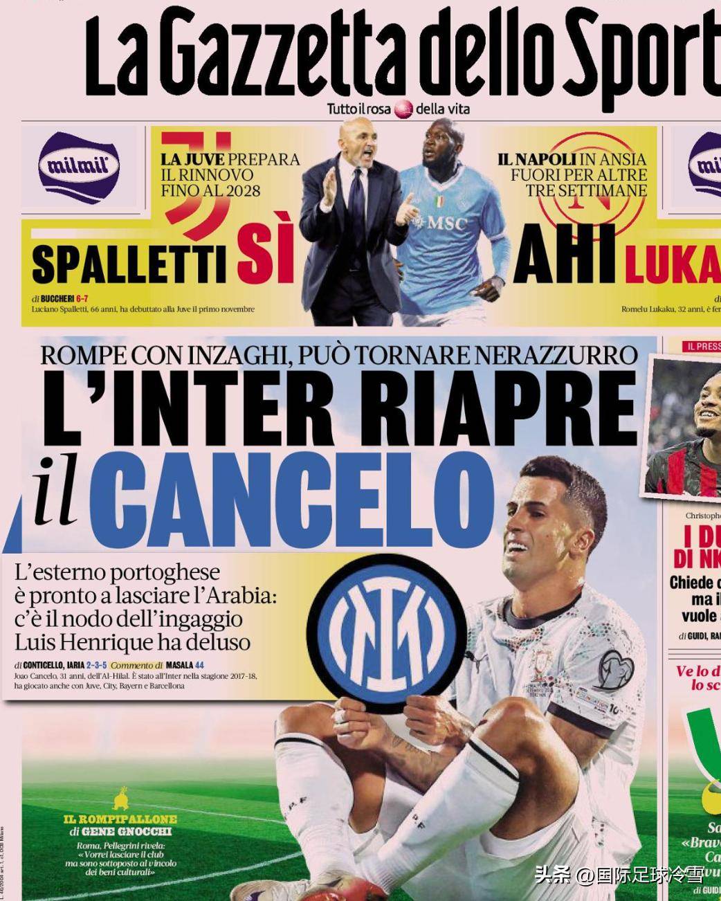 《罗马体育报》的扎扎罗尼透露,坎塞洛个人更想回到巴塞罗那,但如果利雅得新月愿意承担一部分薪资,国米肯定会对球员感兴趣。总之,据他所知,国米内部“有人对待此事非常上心”。