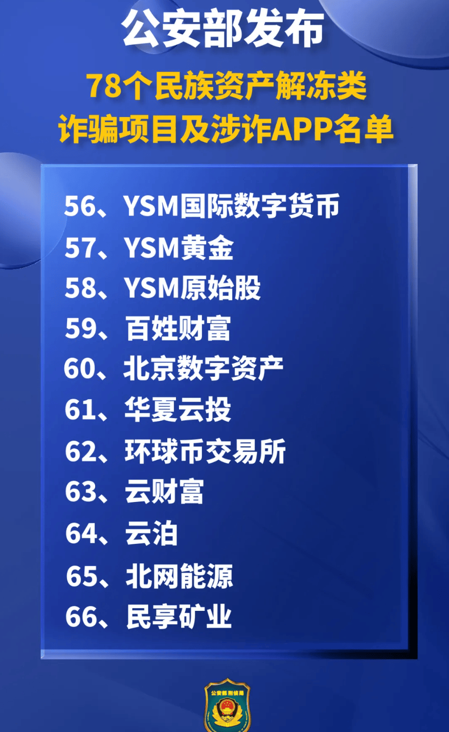 2024年1月9日,公安部公布78个民族资产解冻类诈骗项目,其中第64个就是该项目。