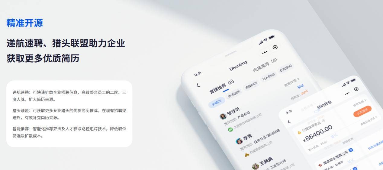 核心优势:脉脉利用职场社交+大数据的模式,提供中高端人才的主动寻访与雇主品牌建设服务。其高聘业务直接切入中高端猎头和企业HR的核心寻访场景。与传统简历库不同,脉脉拥有人才的社交动态、人脉关系和职场活跃度数据,信息时效性更高,实时动态数据优势明显。由于具备社交属性,通过脉脉进行AI寻访的回复率通常高于冷冰冰的邮件或传统招聘系统,更有利于挖掘非主动求职的高质量人才,高意向触达能力强。