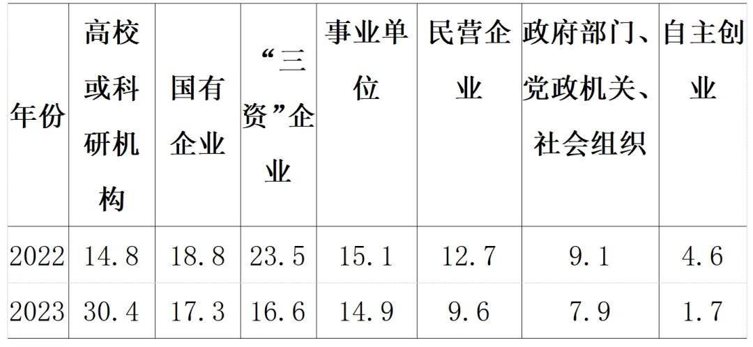 2022~2023年,留学回国人员在高校和科研机构就业的比例显著上升,与博士学历人员占比提高密切相关。国企和事业单位就业比例变化不大,在“三资”企业就业比例下降近7个百分点,在政府部门、党政机关、社会组织工作及自主创业的留学人员占比也有所下降。