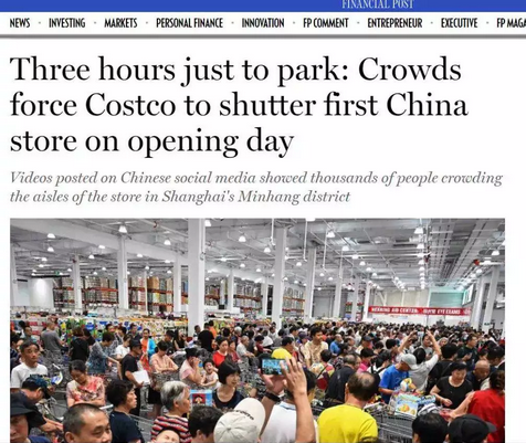 因为人数太多,Costco只能限流放了一部分人进来,但是还是招架不住,被迫开业5个小时就紧急关闭了...也就是说,可能95%的人等了半天,连Costco 上海的大门都没进...这么火的场景,各大搞事的外媒也是看傻眼了,怎能放过蹭这波 Costco 的热度?